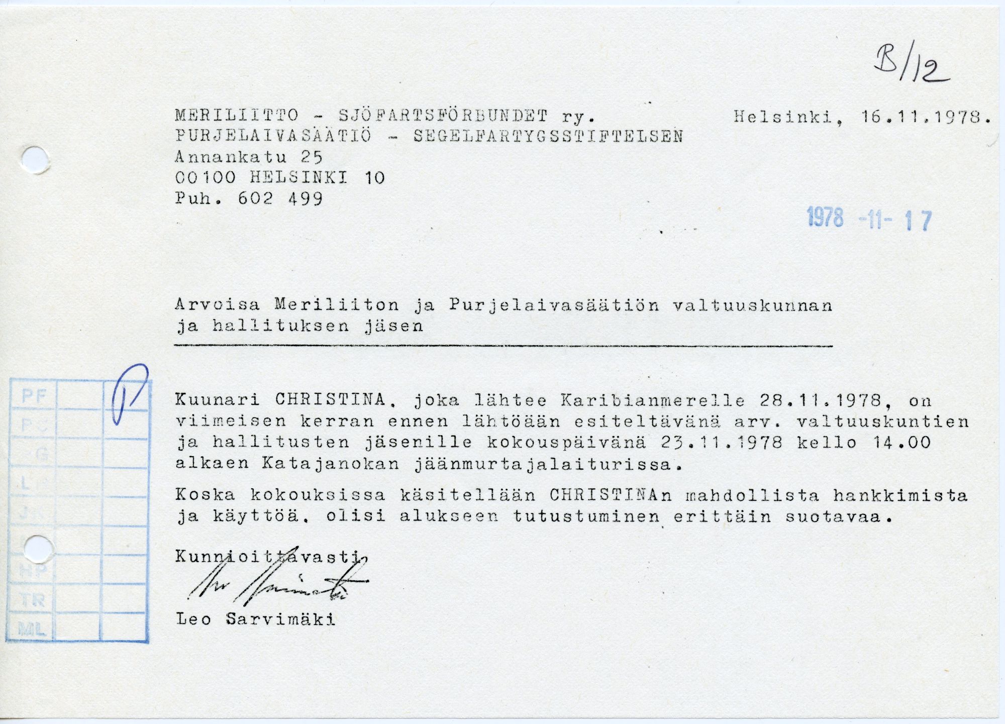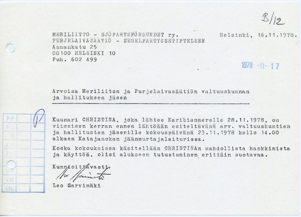 Allekirjoitetaan Purjelaivasäätiö – Segelfartygsstiftelsen -säätiön säädekirja. Säätiön keskeisin tehtävä on hankkia koulutuspurjelaiva. Säätiön perustajina on 43 eri tahoa. Meriliiton valtuuskunta valitsee säätiön valtuuskunnan ja liiton toiminnanjohtaja on säätiön asiamies. Säätiö joutuu odottamaan pitkään saadakseen käyttöönsä sopivan purjelaivan. Vuonna 1983 purjehditaan lainaksi saadulla Skopbank of Finland-nimisellä aluksella, ja lopulta vuonna 1984 päästään vesille omalla haruspurjekuunari Lokilla. Tänä päivänä Suomen Purjelaivasäätiö kyntää Suomen ja maailman meriä kuunari Helenalla.