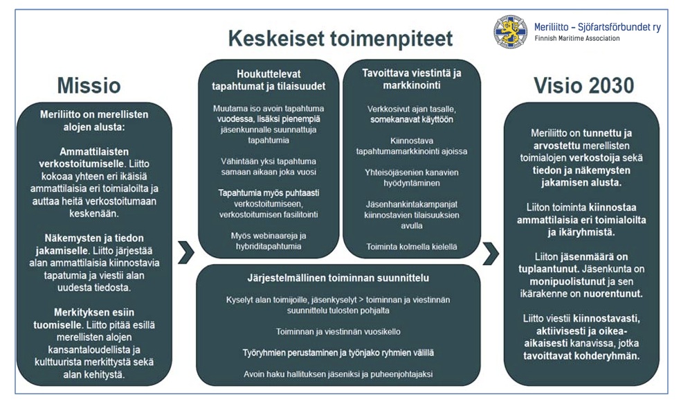 Meriliitto käynnistää liiton strategiasuunnittelun erityisesti digitaalisten kanavien suhteen. Liitto on perinteisesti toiminut vanhan tavan mukaan. Nyt pohditaan, kuinka uudistutaan samalla kun edessä häämöttää kunnioitettu sadan vuoden merkkipaalu. Maailma on tässä ajassa muuttunut paljon, toisinaan sen perässä pysyminen järjestökentällä vaatii pientä päivitystä.