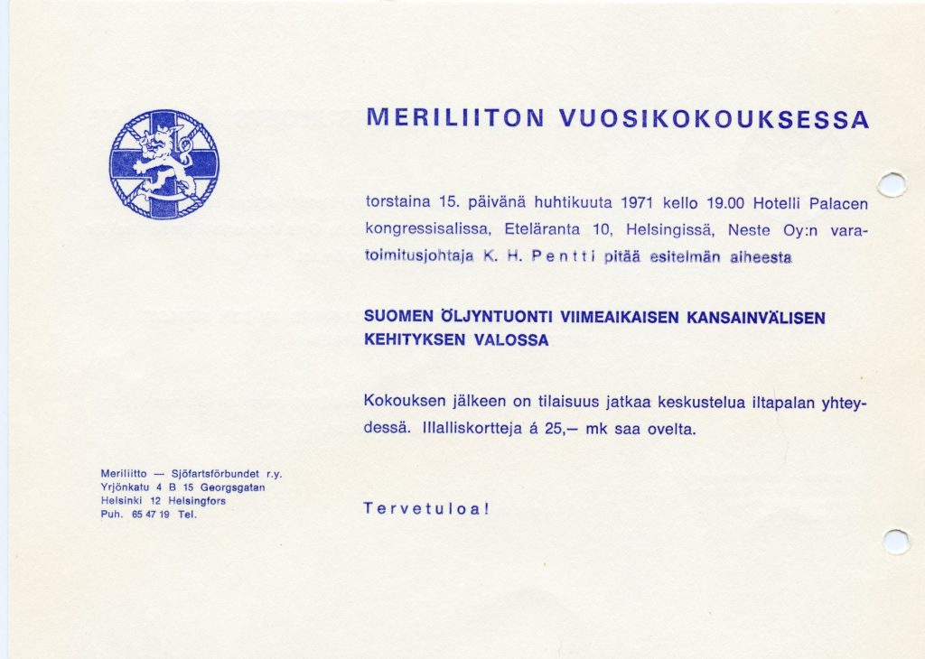 Meriliitto täyttää 50 vuotta ja puolta vuosisataa juhlitaan ravintola Palacessa sekä juhlakokouksen että päivällisen merkeissä.